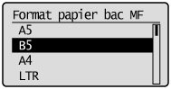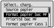 Assurez-vous que le papier indiqué dans le pilote correspond à celui chargé dans la cassette avant d'utiliser l'imprimante. Si vous utilisez le pilote d'imprimante UFR II, chargez du papier au format personnalisé dont les bords longs sont inférieurs ou égaux à 215,9 mm, en orientation Paysage.