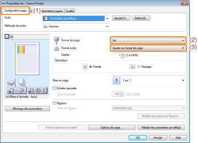 Si les paramètres [Format de page] et [Format sortie] sont différentsL'impression est automatiquement agrandie ou réduite pour s'adapter à la page.