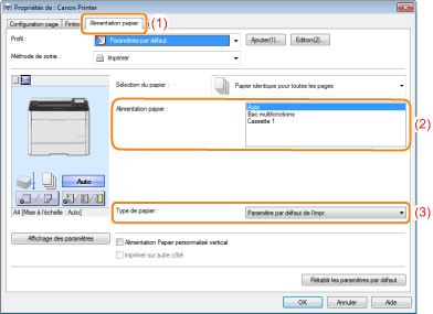 Utilisation de l'aperçu pour indiquer l'alimentation papierVous pouvez également définir une alimentation papier en cliquant sur chaque alimentation papier ou [Auto] en utilisant Aperçu lorsque [