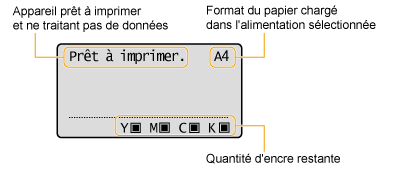 Prêt (vert), le témoin En ligne (vert) et le témoin d'alimentation papier (vert) s'allument, et le message <Prête pour l'impression.> apparaît à l'écran ; l'imprimante est prête pour l'impression. |