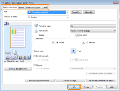 Spécifier les paramètres désirés dans l'écran de pilote d'imprimante → cliquer sur [OK].