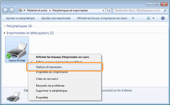 Cliquez avec le bouton droit de la souris sur l'icône de l'imprimante dont vous voulez spécifier les paramètres → cliquez sur [Options d'impression].