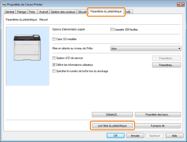 Si l'imprimante et l'ordinateur sont connectés via un port USB ou WSD (Web Services on Devices, services Web sur périphériques), la fonction [Lire l'état du périphérique] n'est pas disponible. Il est nécessaire de configurer les paramètres manuellement.