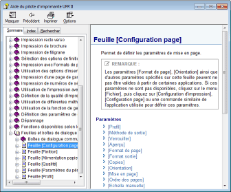 Volet navigation (côté gauche) : cliquer sur [Sommaire]/[Index]/[Rechercher] pour rechercher des informations.