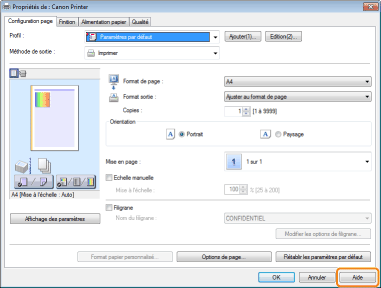 Pour afficher l'aide en ligne, cliquer sur [Aide] sur l'écran du pilote d'imprimante.