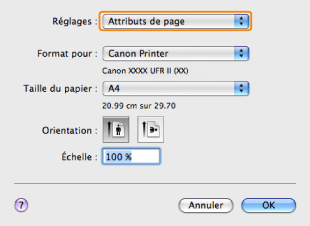 Sous Mac OS X 10.5.x, la boîte de dialogue [Réglages] varie selon l'application que vous employez.