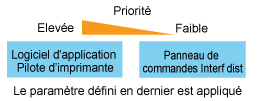 Lorsque les valeurs d'un même paramètre sont différentes entre l'application (ou le pilote d'imprimante) et les fonctions de menu, le paramètre défini dans l'application ou le pilote est prioritaire. Si vous définissez une option uniquement dans les fonctions de menu, à l'aide du panneau de commandes ou d'Interf dist, la valeur définie en dernier est utilisée.