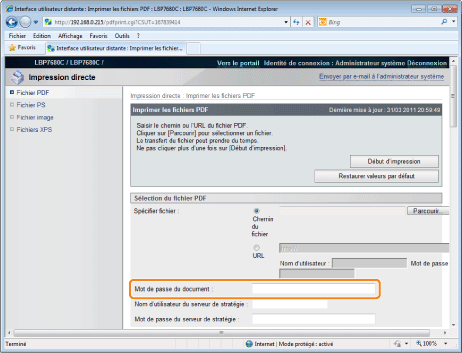 Pour imprimer un fichier PDF lié à un serveur de stratégie, saisissez le [Nom d'utilisateur du serveur de stratégie ] et le [Mot de passe du serveur de stratégie ].