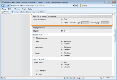 Sélectionnez [Pages], puis entrez le numéro de la page de début et celui de la page de fin pour préciser l'étendue d'impression.