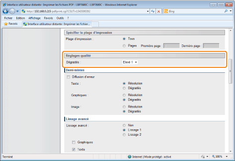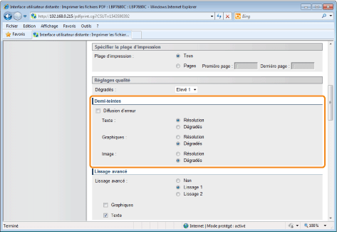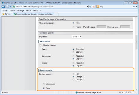 [Graphiques] et [Texte], sur la console de l'imprimante, ne peuvent être utilisés que si l'option [Lissage avancé] du pilote d'imprimante est configurée sur [Paramètre par défaut de l'impr.].