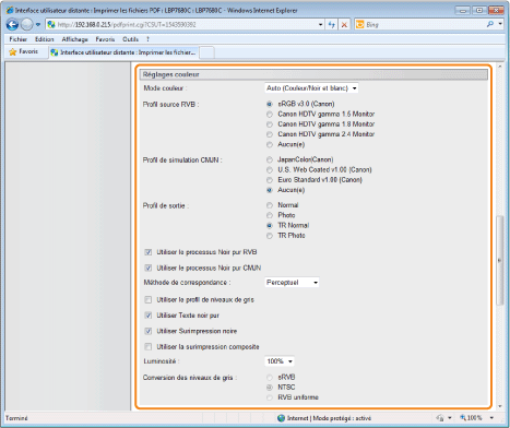 Vous pouvez choisir un profil RVB adapté aux fonctions de l'écran que vous utilisez. Activez-le pour imprimer des images dessinées avec un modèle de couleurs RVB ou des documents contenant des images.