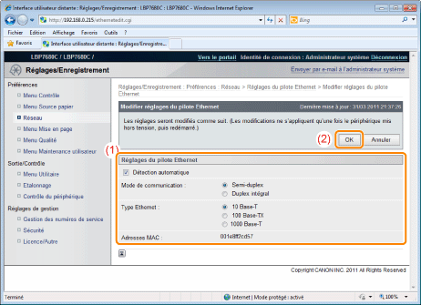 Si vous souhaitez que la méthode de communication et le type Ethernet soient automatiquement définis, cochez la case [Détection automatique]. Pour préciser la méthode communication et le type Ethernet, décochez la case [Détection auto] et définissez les points suivants.