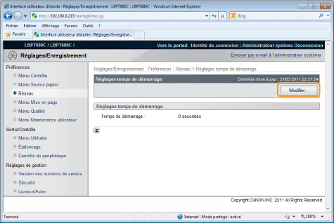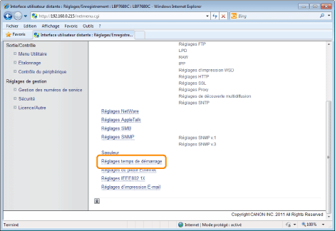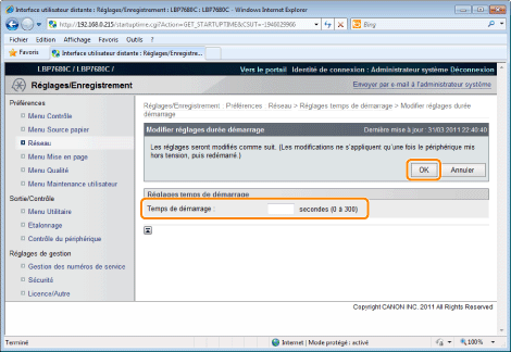 Sélectionner le temps de démarrage entre l'allumage de l'imprimante et le moment où elle commence à communiquer (temps d'attente au démarrage de 0 à 300 secondes).