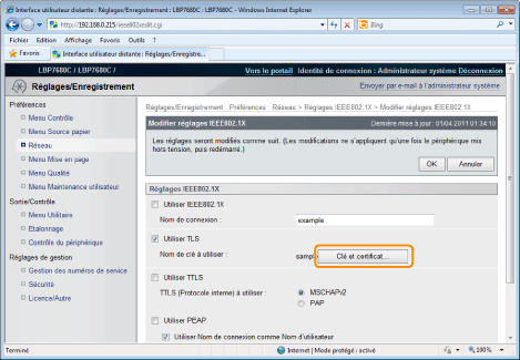 Vous devez enregistrer à l'avance une clé et un certificat ou un certificat CA utilisé pour l'authentification sur l'imprimante.