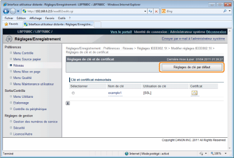Sélectionnez la clé à utiliser, puis cliquez sur [Réglages de clé par défaut].