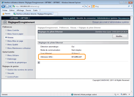 L'impression de l'état du réseau est exécutée. L'adresse MAC (A) figure sous [Configuration du pilote Ethernet] dans l'angle supérieur gauche de la page Impression de l'état du réseau.