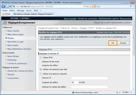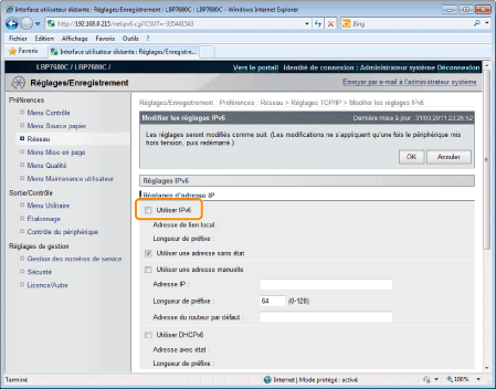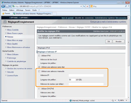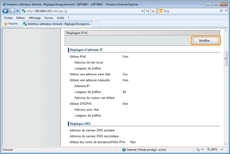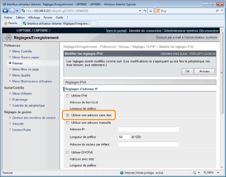 Rétention d'adresses sans étatUne fois la case [Utiliser une adresse sans état] cochée et l'imprimante redémarrée, l'adresse sans état s'affiche automatiquement. Elle est supprimée lorsque l'imprimante est éteinte.