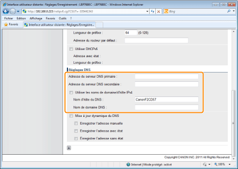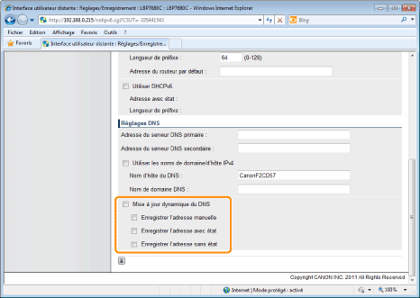 Cette fonction peut être utilisée dans un environnement utilisant un serveur DNS dynamique. Utilisation de la fonction de mise à jour dynamique du DNSVous devez définir l'adresse IP, le nom d'hôte et le nom de domaine du serveur DNS.