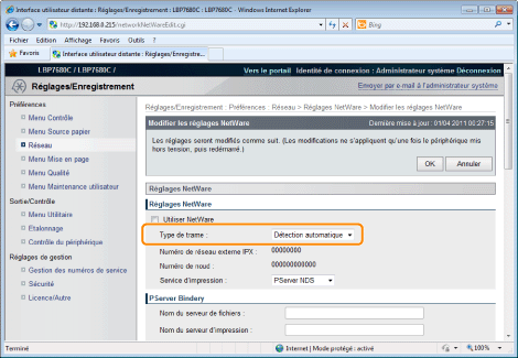Sélectionnez le type de trame utilisée par l'environnement système que vous utilisez dans [Détection automatique], [Ethernet II], [Ethernet 802.2], [Ethernet 802.3] ou [Ethernet SNAP].
