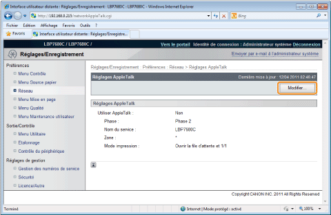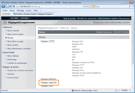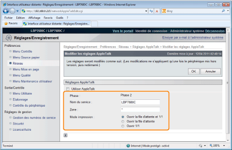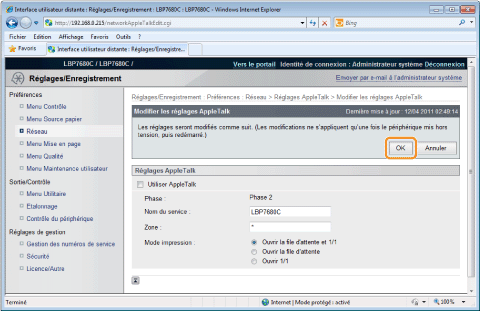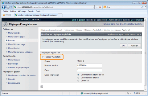 Si la case [Utiliser AppleTalk] est décochéeL'imprimante n'est pas détectée sur le réseau AppleTalk.
