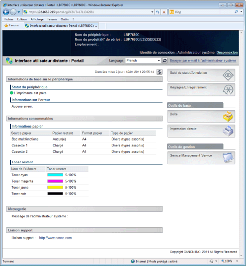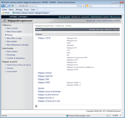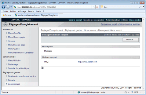[Service de gestion des services] (LBP7680Cx uniquement)Affiche l'écran SMS (Service Management Service).
