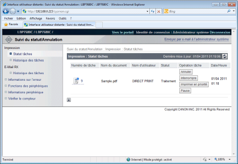 [Suivi du statut/Annulation]Vous pouvez vérifier et modifier l'état des travaux traités par l'imprimante. Vous pouvez également vérifié l'état du périphérique.