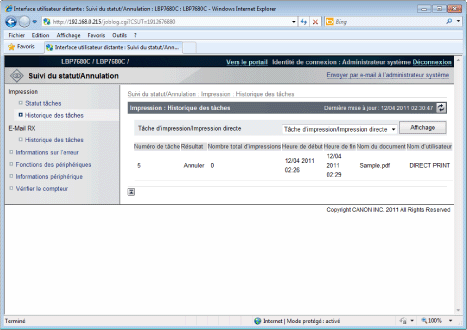 Affichage de la page [Historique des tâches]L'affichage de l'historique des travaux est possible uniquement s'il est autorisé par [Afficher l'historique des tâches] dans [Réglages/Enregistrement] – [Réglages de gestion] – [Sécurité].