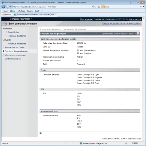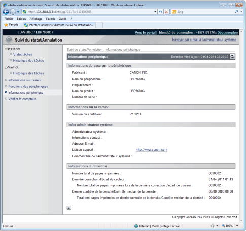 [Informations de base sur le périphérique]Les informations de base relatives à l'imprimante s'affichent.