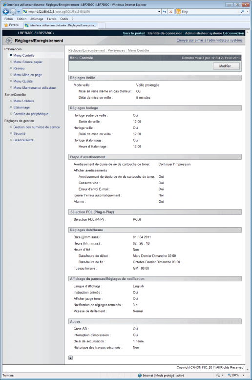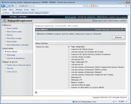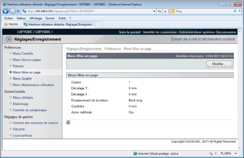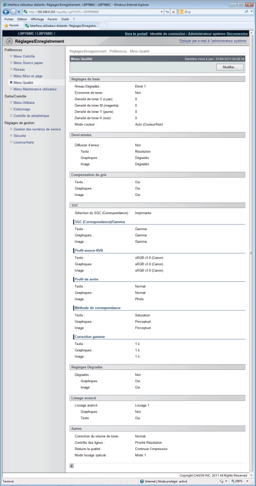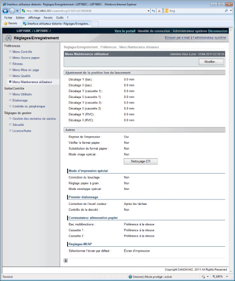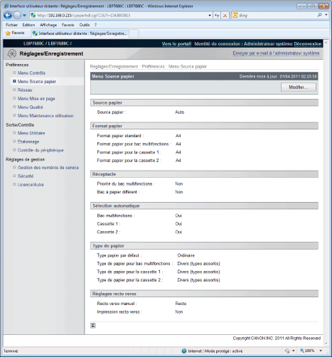 [Réglages/Enregistrement]Vous pouvez configurer/modifier plusieurs paramètres de l'imprimante. Les rubriques que vous pouvez configurer/modifier diffèrent en fonction du fait que vous êtes connecté en tant qu'administrateur ou utilisateur final.