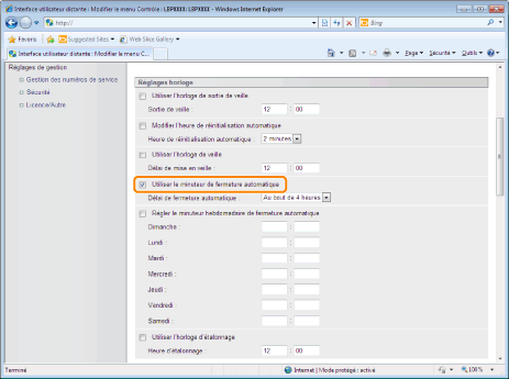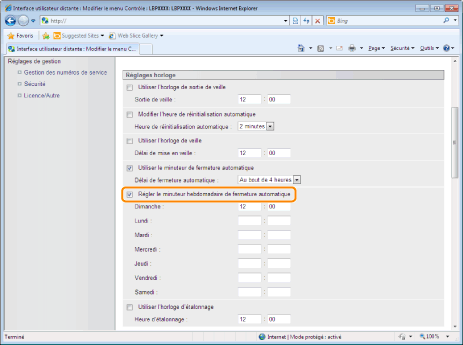Cochez la case [Régler l'horloge hebdomadaire de fermeture automatique].