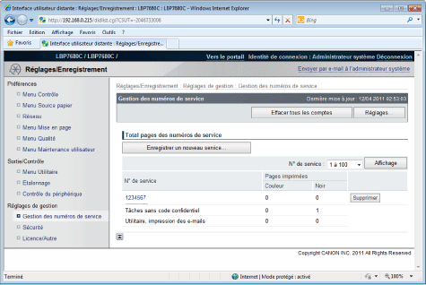 [N° de service](Accessible uniquement si vous vous êtes connecté en mode Administrateur.)