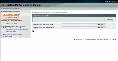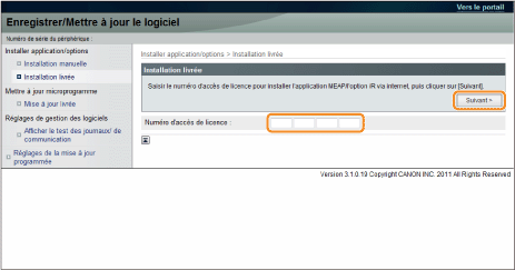 A partir de la page d'accueil de l'Interf dist; cliquez sur [Réglages/Enregistrement] → [Licence/Autre] → [Mémoriser/Mettre à jour le logiciel].