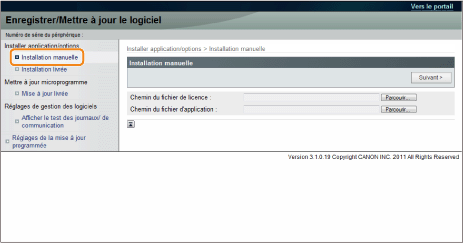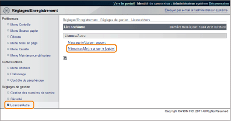 À partir de la page d'accueil de l'Interf dist; cliquez sur [Réglages/Enregistrement] → [Licence/Autre] → [Mémoriser/Mettre à jour le logiciel].