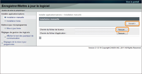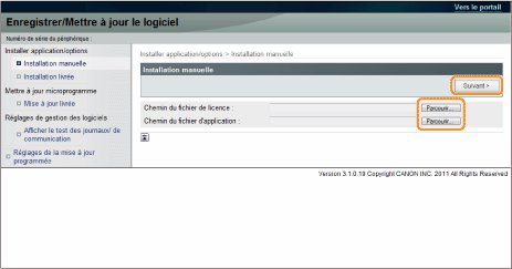Cliquez sur [Parcourir] → sélectionnez le fichier de licence et le fichier d'application à installer → cliquez sur [Suivant].