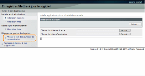 À partir de la page d'accueil de l'Interf dist; cliquez sur [Réglages/Enregistrement] → [Licence/Autre] → [Mémoriser/Mettre à jour le logiciel].