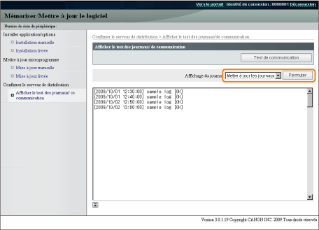 Les journaux d'installation des options système/applications MEAP et le journal de mise à jour du micrologiciel sont affichés.