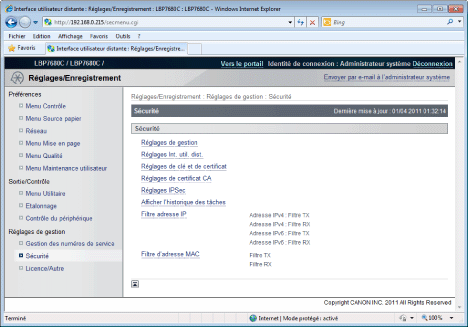 Seul l'administrateur (utilisateur connaissant le mot de passe) peut configurer les paramètres ou exécuter des opérations liées à la gestion de l'imprimante en entrant le mot de passe de l'administrateur.