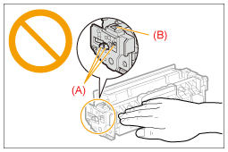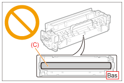 ![]() Ne touchez pas les contacts électriques (A), la mémoire de la cartouche d'encre (B) ni le tambour photoconducteur (C).Le fait de toucher les contacts électriques (A) ou la mémoire de la cartouche d'encre (B) pourrait provoquer des dégâts.