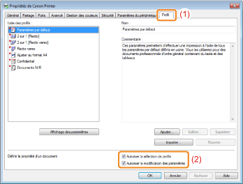Cocher les cases [Autoriser la sélection de profils] et [Autoriser la modification des paramètres].
