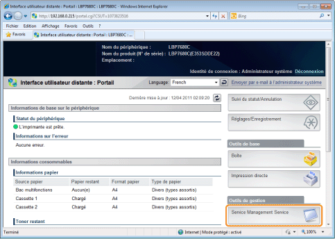 Numéro de série du périphériqueLe numéro de série de l'imprimante est inscrit en haut à gauche de l'écran. (Le numéro de série du périphérique est requis pour obtenir le fichier licence auprès du système de gestion des licences.)