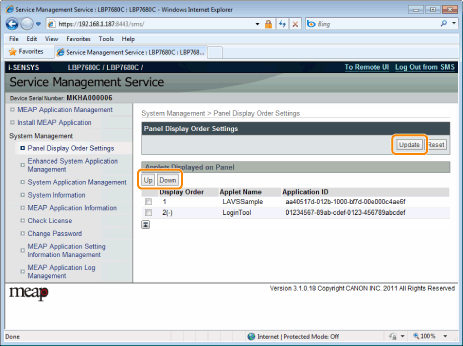 Déplacez les applets vers le haut et vers le bas en cliquant sur [Up] et [Down].