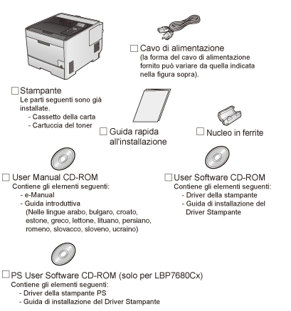 Scaricare il driver della stampante per Macintosh dal sito Web di CanonIl CD-ROM fornito a corredo non contiene il driver della stampante per il sistema operativo Macintosh. Scaricare dal sito Web di Canon (http://www.canon.com/) il driver della stampante per il sistema operativo Macintosh. Se non si riesce a trovare il driver della stampante per Macintosh sul sito Web di Canon, rivolgersi al rivenditore Canon autorizzato più vicino.