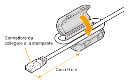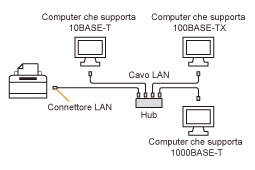 Utilizzare un cavo con doppino ritorto di Categoria 5 o superiore per la LAN. Per collegare la stampante a una rete Ethernet 100BASE-TX o 1000BASE-T, tutte le periferiche da collegare alla LAN (hub, cavo LAN e scheda di rete per il computer) devono supportare 100BASE-TX o 1000BASE-T.