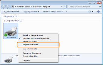 Fare clic con il tasto destro del mouse sull'icona della stampante da configurare → fare clic su [Proprietà stampante] (o [Proprietà]).