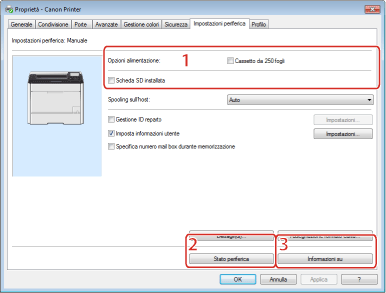 È possibile ottenere informazioni sulla periferica e aggiornare le impostazioni visualizzate nella scheda (vedere "Impostazione delle opzioni della stampante").