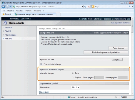 Selezionare [Pagine] e inserire il numero della pagina iniziale e quello della pagina finale per impostare l'intervallo delle pagine da stampare.
