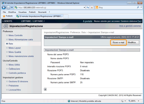 Quando si utilizza il protocollo POP3Quando l'opzione è impostata per ricevere e-mail automaticamente utilizzando [Intervallo ricezione POP3], se si tenta di ricevere manualmente le e-mail mentre una e-mail è in corso di ricezione automatica, le azioni dell'utente verranno ignorate.