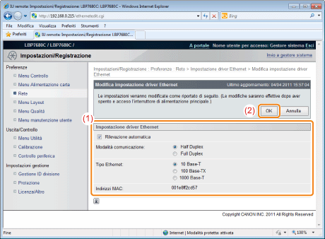 Se si desidera definire le impostazioni per il metodo di comunicazione e il tipo di Ethernet, deselezionare la casella di controllo [Rilevazione automatica] ed eseguire le impostazioni seguenti. Utilizzando [Modalità comunicazione], selezionare il metodo di comunicazione Ethernet corrispondente all'ambiente di rete in uso.