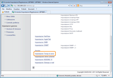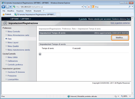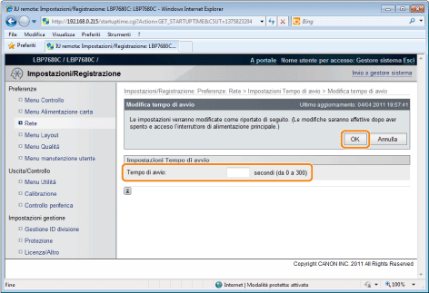 Immettere il tempo di avvio tra l'istante in cui la stampante viene accesa all'instante in cui la stampante inizia la comunicazione (da 0 a 300 secondi).