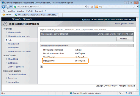Viene generata la Stampa stato della rete. L'indirizzo MAC (A) è quello indicato in [Impostazioni driver Ethernet] in alto a sinistra della Stampa stato della rete.